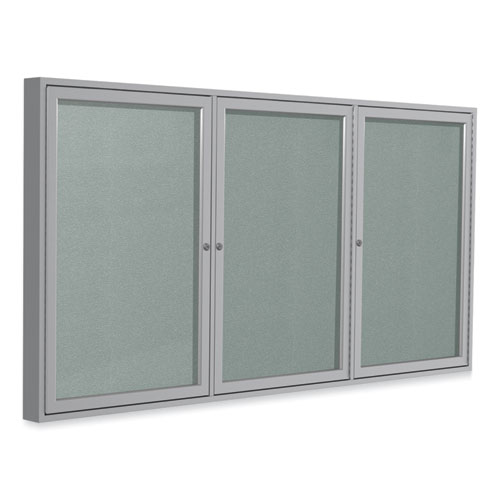 3 Door Enclosed Vinyl Bulletin Board with Satin Frame, 72″ x 48″, Silver Surface, Satin Aluminum Frame
