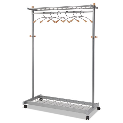 Garment Racks, Two-Sided, 2-Shelf Coat Rack, 6 Hanger/6 Hook, 44.8w x 21.67d x 70.8h, Silver/Wood