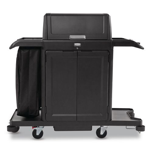 Housekeeping Cart with Hood and Doors, Plastic, 4 Shelves,1 Bin, 24.4 x 62.4 x 56.9, Black