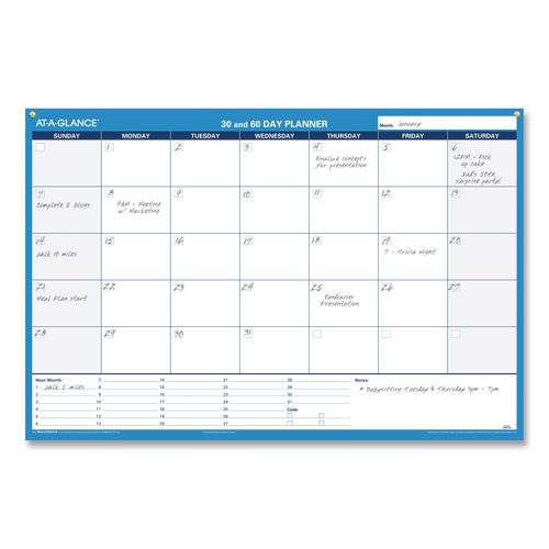 Plan a month or two ahead with this undated wall calendar. Erasable and reversible, the calendar is extremely flexible, letting you plan on a 30-day or 60-day time frame. Reversible design allows you to plan one or two months at a time. Write-on/wipe-off surface for use with wet-erase markers. Notes space for next month’s plans. Wet-erase marker included.