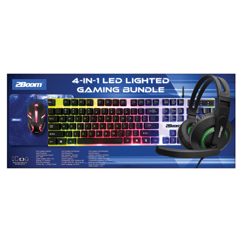 This 4-in-1 gaming bundle has it all–keyboard, mouse, gaming headset and mousepad. Enjoy the colorful light FX on the light-up keyboard and mouse. The headset has a microphone and is lightweight for comfort. Gaming mousepad provides high precision control.