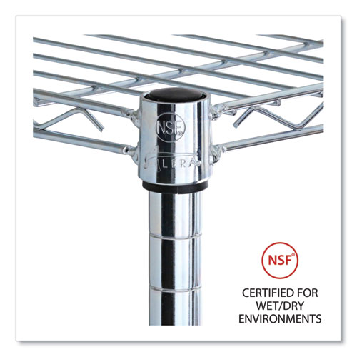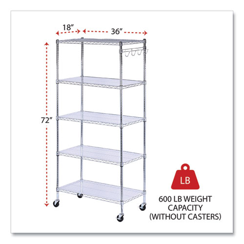 Ideal storage solution for commercial use. Snap-together design assembles in minutes. Strong welded wire construction provides exceptional strength and stability. Open design allows air circulation and reduces dust build-up. Includes five shelves, posts, shelf clips, shelf liners, casters, hooks and leveling glides (if used without casters). Up to 600 lbs per shelf (evenly distributed) when used without casters. Casters (two locking) provide mobility and can be omitted to increase weight capacity of unit.