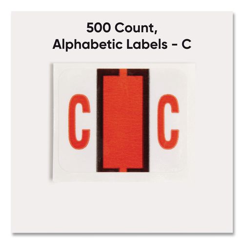Keep files organized at a glance with these alphabetic labels that feature a wraparound solid color bar and a colored character printed on a white background. Colors are compatible with end tab systems using the bar-style format. Convenient dispensing box for easy peel off and application. Includes 500 labels per roll. Compatible with Tab® Products 1283 series alphabetical labels.