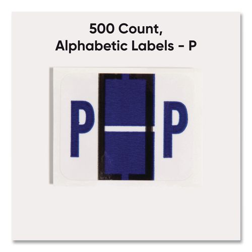 Keep files organized at a glance with these alphabetic labels that feature a wraparound solid color bar and a colored character printed on a white background. Colors are compatible with end tab systems using the bar-style format. Convenient dispensing box for easy peel off and application. Includes 500 labels per roll. Compatible with Tab® Products 1283 series alphabetical labels.