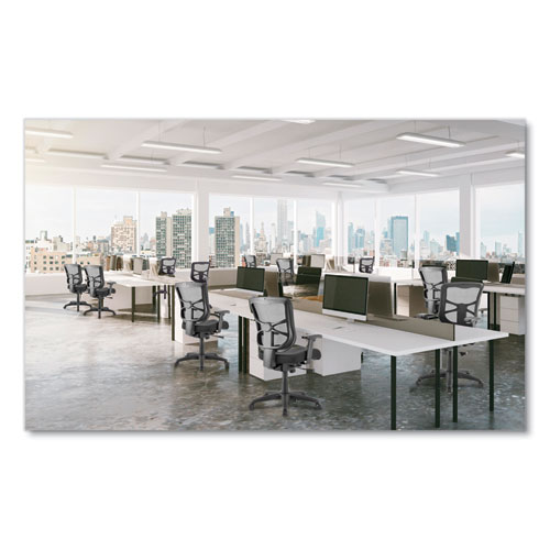 Ergonomic design adjusts to fit multiple users. Cool, breathable mesh back. Contoured seat cushion with waterfall edge to help relieve pressure on legs. Height- and width-adjustable arms with soft polyurethane pads. Five-star base with casters for easy mobility.