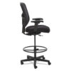 Ergonomically designed stool adjusts to fit multiple users. Cool, breathable mesh back. Contoured seat cushion with waterfall edge to help relieve pressure on knees. Adjustable foot ring for leg support. Weighted steel reinforced five-star base with casters and also compatible with glides, which are sold separately. Height adjustable ratchet back for optimal lumbar support. Height- and width-adjustable arms with soft pads.