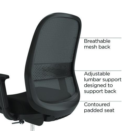 Enhance your office setup for better productivity with Alera® Kempton ergonomic stool. Built with a sturdy five-star base, it offers stability and supports up to 275 lbs for lasting durability. The adjustable armrests provide forearm support, helping to keep your shoulders aligned, while the rolling casters ensure smooth, effortless movement. Designed with adjustable lumbar support, this stool promotes healthy posture by mimicking the natural curve of your spine. The waterfall seat design, combined with molded foam padding, maximizes comfort, even during long periods of use.