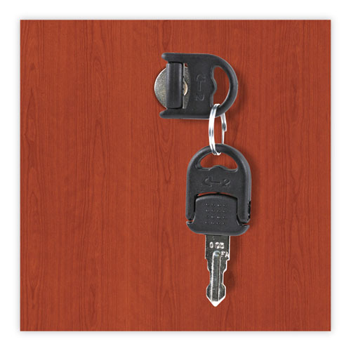 Pedestal file cabinet attaches under worksurface. Sturdy, four-sided drawer construction with separate front panel. Full-extension ball bearing slides on file drawer. Drawers lock for securing contents. Durable 3 mm edge banding protects against bumps and dings. Two, fold-away safety keys for a slimmer profile are included.