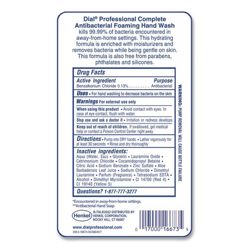Dial® Professional Antimicrobial Foaming Hand Wash kills 99.99% of bacteria encountered in away-from-home settings. Its hypoallergenic foam is as mild as water itself and gentle on skin. For use with Dial FIT Dispensers.