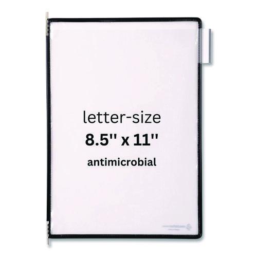 Non-glare, PVC frame display pockets have patented antimicrobial compound (silver ions) mixed into the display panels that provide an effective and long-lasting protection against microbial proliferation on the product. Designed to hold letter-size documents. On documents handled by numerous users, microbes, germs and bacteria can reproduce, transmit and possibly cause contagious diseases. The silver ions embedded in the antimicrobial display pockets deter microbial growth on the product by eliminating micro-organisms presenting a health risk. Stops germs and bacteria in under two hours.