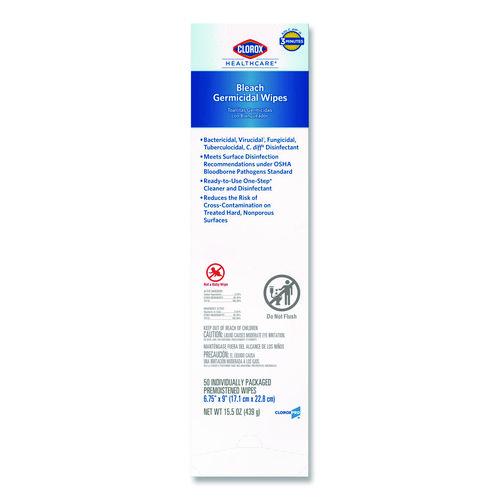 Bleach Germicidal Wipes, Individual Wipes, 1-Ply, 6.75 x 9, Unscented, White, 50/Box, 6 Boxes/Carton
