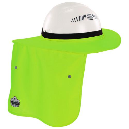 The Chill-Its 6661 Universal Hard Hat Brim with Neck Shade attaches to hard hats and safety helmets to shade the face and neck for protection against sun damage. This flexible full brim shade features a silicone-lined elastic interior to securely grip and attach to most hard hats and safety helmets. A wide panel shade with UPF 50+ protection extends down for complete back-of-neck coverage. For a customized fit, the neck shade can be rolled away and snapped into storage when not in use. A darker tinted underside of the brim helps to reduce excessive glare from the sun. Hi-vis color to keep workers safe and seen. Hand wash as needed and hang to dry. Ideal for those working in sunny environments where shade is needed when wearing hard hats or safety helmets, including construction, roofing and landscaping.