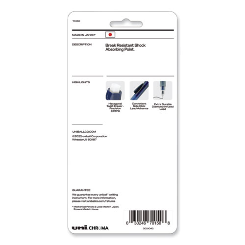 Draw, write, sketch or illustrate with CHROMA Mechanical Pencils from uni-ball. These 0.7 mm HB #2 mechanical pencils feature auto-advancing lead, so you won’t experience any interruptions as you write. A shock-absorbing cushioned point reduces lead breakage and facilitates smooth writing. Create vivid text and graphics with 0.7 mm mechanical pencils, which produce striking, dark marks. This side click mechanical pencil comes with a unique hexagonal eraser that has twelve points and edges for optimal editing prevision. Ideal for school work, art projects and note-taking, these refillable pencils have a comfort grip that reduces fatigue while helping you maintain control. CHROMA combines the most popular features requested by mechanical pencil lovers so you can enjoy cutting-edge performance with an endless flow of ideas.