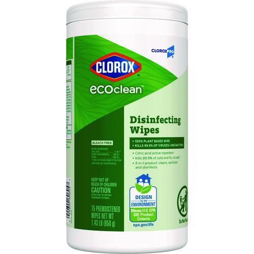 Clorox EcoClean. A Clorox clean that’s powered by nature. These cleaning and disinfecting wipes are EPA Design for the Environment certified, have a 100% plant based cloth and are made without bleach, ammonia, alcohol or dyes. They kill 99.9% of germs with a citric acid active ingredient that disinfects, sanitizes, cleans and removes allergens from high touch surfaces without the need for gloves, goggles or personal protective equipment (PPE). Use them to quickly clean and disinfect kitchen counters, sinks, light switches, door handles, desks and chairs in commercial facilities like schools, colleges, offices, restrooms and hotels. Part of the Clorox EcoClean™ line of EPA Safer Choice and DFE certified products, EcoClean™ Disinfecting Wipes deliver a clean you can count on. 100% plant based active ingredient and substrate. When used as directed on hard nonporous surfaces. Pet dander, cockroach matter, pollen particles, dust mite particles.