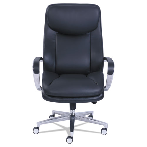 Premium La-Z-Boy® Commercial ComfortCore® with gel memory foam seat construction for added comfort and heat dispersal. Knee tilt seat plate with four point locking tilt positions and seat slider. Upholstered in commercial grade black bonded leather. Aluminum arms with PU arm pads. Five-star aluminum base with casters for easy mobility. Supports up to 400 lbs.