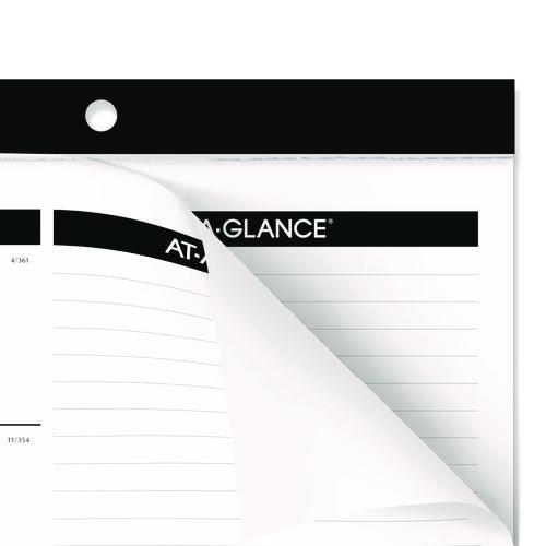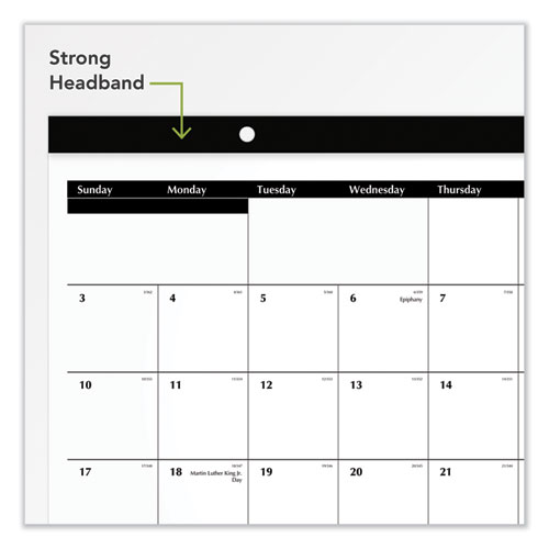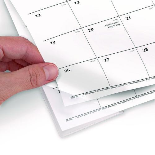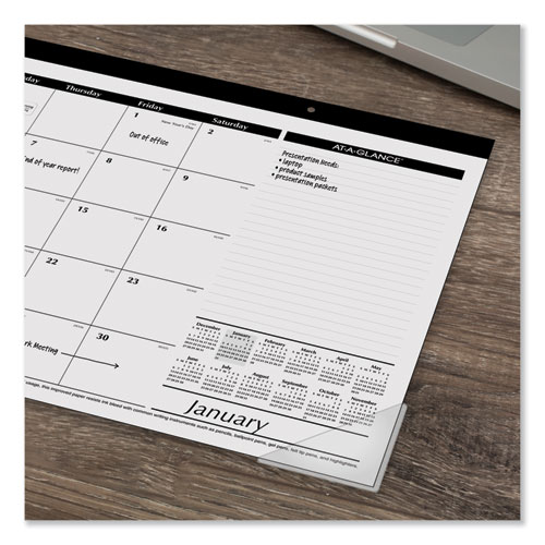 This compact desk pad is ideal for smaller workspaces and helps you plan ahead. Displays one month per page with unruled daily blocks for marking key dates, plus a notes column and full year calendar reference for date checking. Take advantage of versatile daily planning with unruled 1.5 x 1.5 inch blocks on this desk pad calendar. Each date is open for you to jot down any important notes, and there’s a large ruled notes block on each page for detailed reminders. The compact desk pad has a 17 3/4″ x 10 7/8″ size. It has neat black and white coloring. Every monthly calendar page is perforated for neat removal and disposal at the end of each month. Looks great in any workspace. Printed on high-quality paper with superior ink bleed resistance.
