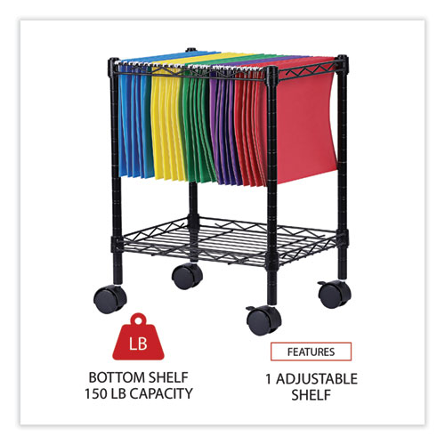Mobile files help keep papers organized and handy when you need them and out of the way when you don’t. Accommodates letter size hanging files. Versatile front to back or side to side filing. Four 2″ hooded casters, two locking. The bottom shelf adjusts in 1″ increments and is rated at 150 lbs. Assembles quickly and easily, without tools. Hanging file folders sold separately.
