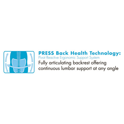 Pivot Reactive Ergonomic Support, PRESS, back health technology is a fully articulating backrest that offers continuous lumbar support at any back angle. SertaPedic® comfort support system with layers of molded foam, memory foam, and pocket coils. Upholstered in black commercial grade bonded leather. Flip up arms with soft arm rests. Pneumatic lift with tilt tension adjustment and lockout feature. Five-star nylon base with casters for easy mobility. Supports up to 275lbs.