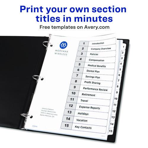 Sometimes finding information at a moment’s notice seems like finding a needle in a haystack. These Ready Index® Table of Contents Dividers help you stay organized so you can locate important documents quickly and easily. They feature preprinted alphabetical or numerical tabs that are reinforced for durability and can be used in either landscape or portrait format. Using free templates from Avery Design & Print, you can customize the included title page and print in minutes. Organization and efficiency,— now that’s sharp thinking.
