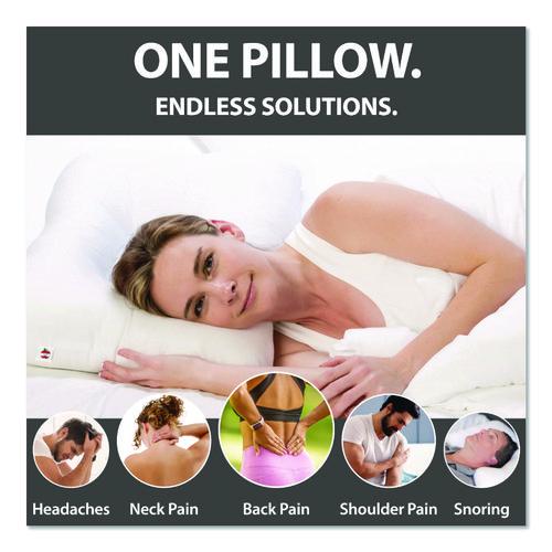 Patented D-shaped center gently supports the head while lobe supports the neck, helping restore the natural curvature of the neck and upper spine. Helps relieve tension headaches, neck spasms, arthritis and snoring. Exceptional support for side and back sleepers. Shaped center gently cradles the head while sleeping on your back. Cover is 50% polyester and 50% cotton, filling is 100% virgin polyester. Fits standard pillow cases.