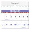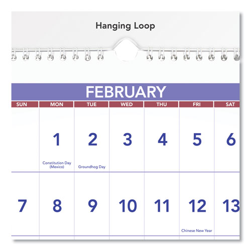 Three-month per page view: past, current and future months. Large, easy-to-read numbers. Federal holidays highlighted. White wirebound with hanging loop.