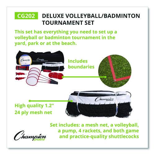 The Champion Sports Deluxe Volleyball/Badminton Tournament Set has everything you need to set up a volleyball or badminton tournament in the yard, park or at the beach. Designed to last, the durable powder-coated aluminum poles are strong enough to endure even the most intense smashes and the high-quality mesh net features waterproof tarpaulin tapes to help it stand up to the elements outdoors. The volleyball and badminton set includes a volleyball, a pump for quick and easy ball inflation, four rackets, and both game and practice-quality shuttlecocks. The whole set packs away neatly into a weather-resistant carrying case for easy transportation and storage.