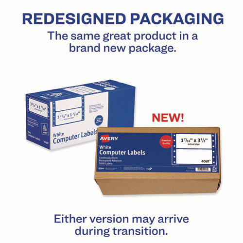 Print large quantities of labels on continuous label sheets with Avery labels for pin-fed and dot matrix printers. Each sheet is perforated so that you can easily separate the labels. Each label uses permanent adhesive that sticks and stays securely without having the corners lift and curl. The permanent adhesive works great on paper, cardboard, glass, and metal and are ideal as mailing and shipping labels. Perfect for big projects and large quantities, continuous-feed labels let you print thousands of labels without having to constantly reload sheets into a standard desktop printer. Easily print address labels, shipping labels, product labels, file folder labels, barcode labels and more.