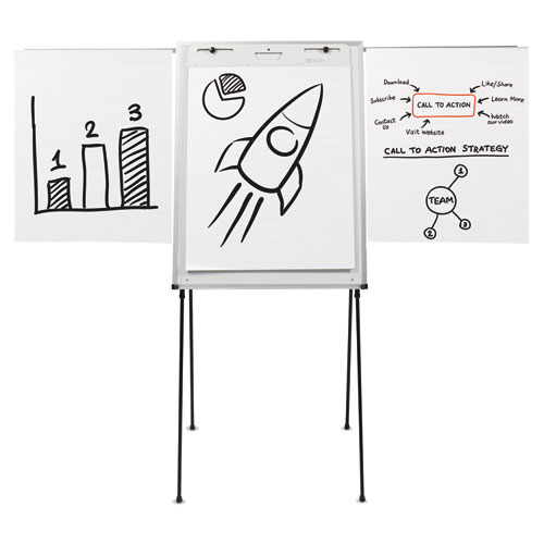 Durable steel easel with smooth whiteboard writing surface and flipchart pad holder. Delivers effective performance when collaboration is needed in low-use work environments. Flexible frame adjusts from 40″ to 70″ in height, allowing for tabletop and free-standing presentation versatility. Extend surface life with regular cleanings using Quartet® cleaning solutions. Sturdy steel legs with rubber feet prevent skidding and protect floors from scratches. Accessory tray features protective end caps to hold markers and erasers in place for convenient access. Includes one Quartet® dry-erase marker.