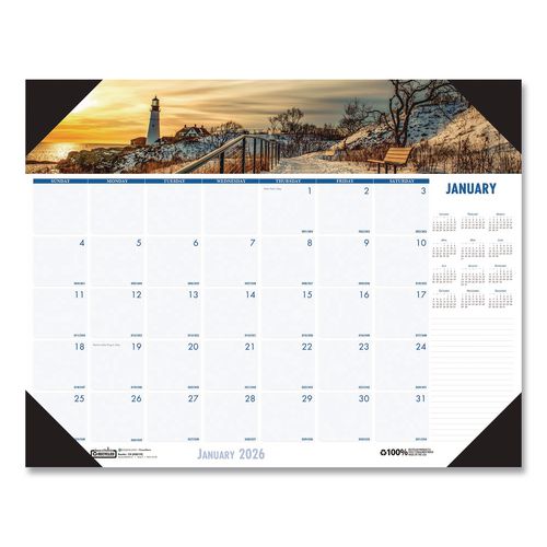 This desk pad calendar features a unique coastline image on each page, Julian dates and days remaining, note space, and full-year reference calendar on each page for long-term planning. Strong, reinforced black leatherette corners help keep pages in place and protected. It’s perfect for an office desk or any other environment that calls for organization. Made entirely of recycled materials.