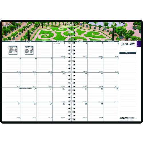 Each weekly and monthly spread has a beautiful garden scene to view, as you enter your appointments. Finding a specific date is easy thanks to colorful, printed monthly indicators. Features full Saturday and Sunday appointment spaces, Julian dates with dates remaining and a black suede-like cover to withstand ongoing use throughout the year. Made entirely of recycled materials.