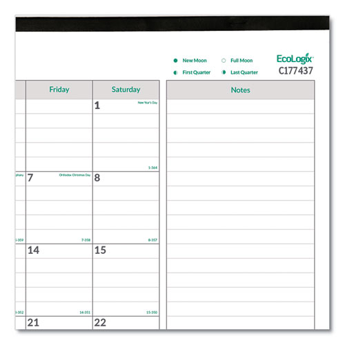 Designed with the future in mind with an eco-friendly tip each month. Ruled daily blocks, note space and a full-year reference calendar for future planning. Perforated sheets for easy removal. 100% post-consumer recycled paper.