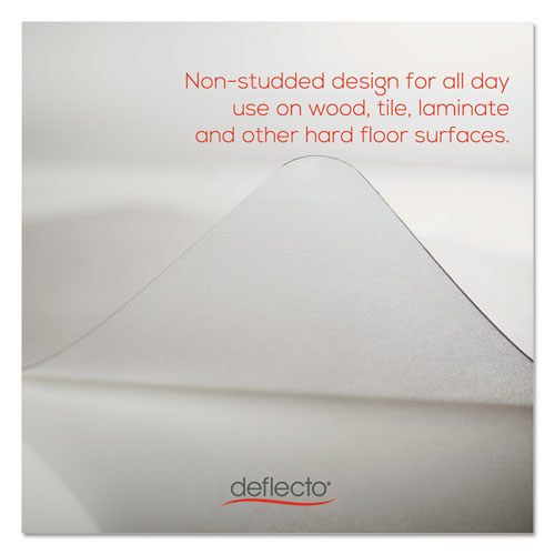 Thinner, lightweight, non-studded EconoMat for hard floors is an excellent value for anyone looking for an all-day use office chair mat to protect wood, tile, laminate and other hard floor surfaces. Easy-glide rolling surface provides smooth office chair movement to help minimize stress and strain on users back, legs and feet, and protects floors from caster wear, spills and heavy traffic. Free and Clear non-orthophthalate, non-cadmium formula promotes a healthy work environment and delivers exceptional clarity without harsh chemicals.