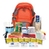Spacious orange backpack has glow-in-the-dark tag that makes it easy to find. Contains essential supplies you need in an emergency based on FEMA and American Red Cross guidelines. Includes water, food, whistle, light stick, flashlight with batteries, rain poncho, emergency blanket, hand warmers, first aid kit, mask, cotton gloves and two hand sanitizer packets. Meets or exceeds OSHA requirements.