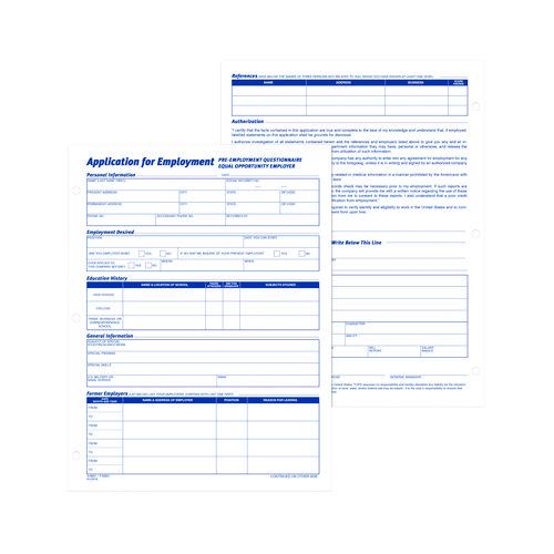 Get contact information, employment history and other information from applicants with these letter-size employment application forms. Make applying for employment simple. Each form is printed in English for convenience, while the three-hole-punched edge lets you conveniently insert them into any standard three-ring binder. These Adams® employment application forms comply with all legal requirements.