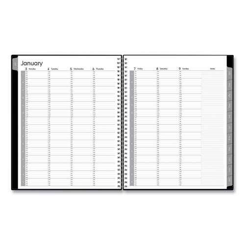 The professional exterior you’re looking for, with the interior content you rely on to manage your workweek and everyday scheduling. This 11″ x 8.5″ appointment-style planner allows you to jot down appointments with 15-minute increment time slots on the weekly calendar pages over a two-page spread. Use the open notes column for reminders and more. Plus navigate your month with the two-page monthly view spread. Twin-wire binding and durable, coated tabs offer easy page turning and access to past, present and future months. Includes a Yearly Goals page, Contacts, Important Dates, five Notes pages, plus years of Holidays.
