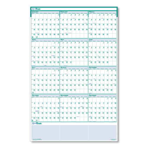 Reversible yearly wall planner features a horizontal format on one side and a vertical format on the reverse to best fit any workspace. Heavy-laminated write-on, wipe-off surface erases clean with a damp cloth, making it easy to change notes and plans. Teal printing on white background helps your notes stand out. Generous open note space for business goals and priorities and numbered weeks. Includes one black, water-soluble marker and hanging tabs. Calendar is printed on 100% recycled paper with soy inks.