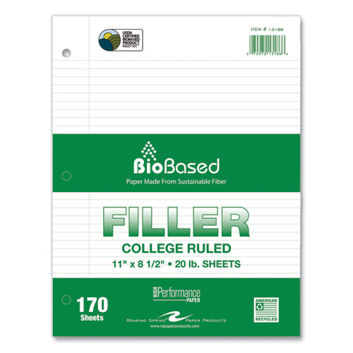 Smooth, white writing paper is produced from sugarcane post-agricultural fiber and post-consumer waste. Paper is high-performance 20#, enabling writing on both sides of the sheet. Each pack contains college ruled sheets with a red margin line. The paper is three-hole punched. Polywrapped with a printed topsheet.