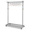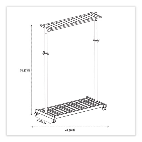 Stylish combination of steel tubing and wood detail. Features six accessory hooks and four casters, two locking. Holds up to 36 garment hangers. Six hangers included.