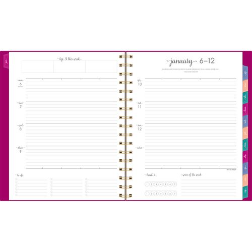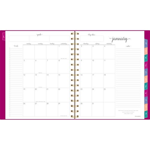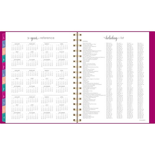 Keep it all together in Harmony this year. The Harmony Weekly/Monthly planner provides the unique layouts and special pages you need to capture just about every aspect of your life, so you can focus on the things that matter. Weekly spreads feature plenty of space for each day as well as dedicated areas for your week’s goals, wins, to-dos and more. Tabbed for easy navigation, each monthly spread features unruled daily blocks along with areas for the month’s goals, to-dos, notes and ideas. In the back of the book, a wide range of resources along with both formatted and unformatted notes and planning pages help you do everything from prioritizing your biggest projects to finding the perfect gifts for the special people in your life. Color-coded repositionable stickers make it easy to add and remove eye-catching notes to all of your important projects, events, appointments and more. Durable, stylish poly cover with gold twin-wire binding adds an element of gratifying sophistication to every practical task, and the double-sided interior pocket hangs onto any loose materials you’d like to keep close. Printed on high-quality paper for superior ink-bleed resistance.