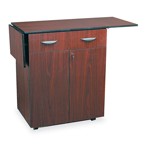 Welcome guests and employees with style and hospitality using this versatile and functional serving station. The drop-leaf design extends to provide a spacious serving area, perfect for coffee stations, snack setups or meeting refreshments. The locking double-door cabinet offers secure storage, featuring a height-adjustable interior shelf to neatly organize coffee supplies, cups and other essentials. A convenient drawer keeps silverware, napkins and smaller items easily accessible, ensuring a well-organized hospitality area. Built for durability and elegance, this stand is constructed from 0.75″ furniture-grade wood with a stain- and scratch-resistant laminate finish, maintaining a professional appearance even in high-traffic areas. Assembly is made simple with cam-lock fasteners, allowing for quick and secure setup. Whether in a breakroom, conference space or reception area, this stylish and functional serving station is the perfect addition to enhance your office’s hospitality experience. Upgrade your space with convenience and class today!