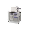 Enhance your workspace with this versatile and stylish machine stand, designed to meet the needs of private offices, collaboration spaces, print areas and meeting rooms. Built for durability and modern aesthetics, the silver powder-coated steel frame ensures long-lasting strength, while the translucent polycarbonate side and back panels add a contemporary touch. The sturdy laminate top provides ample space to accommodate printers, fax machines or other office equipment, making it an essential addition to any professional setting. For efficient organization, the stand features a large enclosed storage area with one fixed shelf concealed behind two translucent hinged doors, perfect for keeping supplies neatly tucked away. Designed for practicality, the built-in cord management system helps maintain a clean and clutter-free workspace. Easily transport this stand wherever it’s needed with its four smooth-rolling casters, including two locking wheels for stability when in use. Whether you need a functional storage solution or a mobile workstation, this machine stand delivers durability, convenience, and a sleek modern design—perfect for any office environment. Upgrade your workspace today!