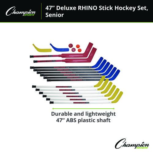 With everything you need to get a group together to play floor hockey, the Champion Sports 47″ Rhino® stick elementary hockey set includes 12 sticks, two red goalie sticks and two no-bounce pucks for indoor use. Designed with ABS plastic shafts, these hockey sticks are exceptionally durable while also being comfortable and lightweight for younger players. The polyethylene reinforced blades will not leave marks or damage gymnasium floors.