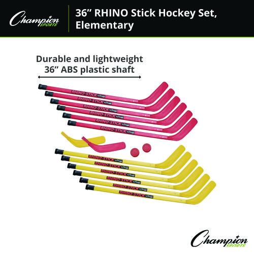 With everything you need to get a group together to play floor hockey, the Champion Sports 36″ Rhino® stick elementary hockey set includes 12 sticks and two no-bounce pucks for indoor use. Designed with ABS plastic shafts, these hockey sticks are exceptionally durable while also being comfortable and lightweight for younger players. The polyethylene reinforced blades will not leave marks or damage gymnasium floors.