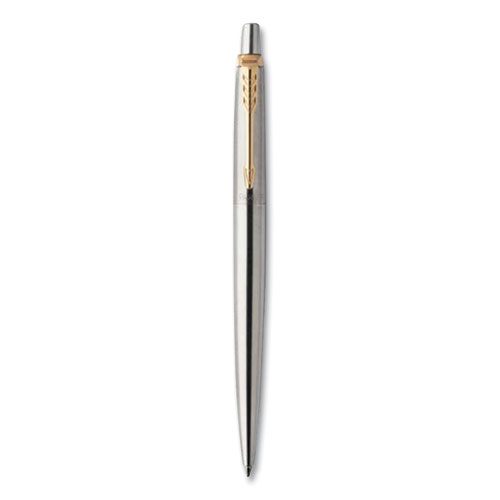 Create easy-to-read messages for members of your team with this black ink pen. The medium point size delivers your ideas in bold ink that resists fading, while the retractable design makes this pen easy to use with a simple click. This refillable Parker Jotter rollerball ink pen is made of stainless steel with a gold trim barrel for a firm grip and a pocket clip for convenient carrying.
