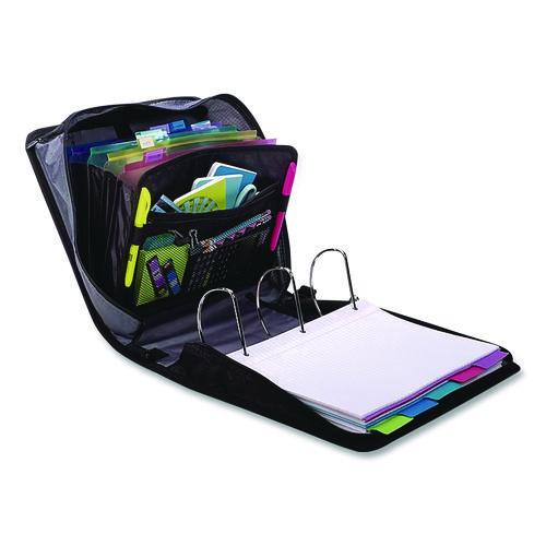 Perfect for organizing all of your classroom essentials. Inside is a 5-tab, 6-pocket expanding file folder to keep all of your important papers secure and organized. You will also find an interior zippered mesh pocket which is perfect storage for your pens and pencils. Large exterior zippered compartment allows you to store other personal items. Patented angled zipper keeps the gusset out of the way when writing. Comes with a handle and shoulder strap enabling ease of transporting materials. Binder gusset is made of Ripstop material, which prevents tearing. Binder is constructed of sturdy Kraft Board–strong enough to last the school year and prevents warping. Unique organizational tools for school or home use.