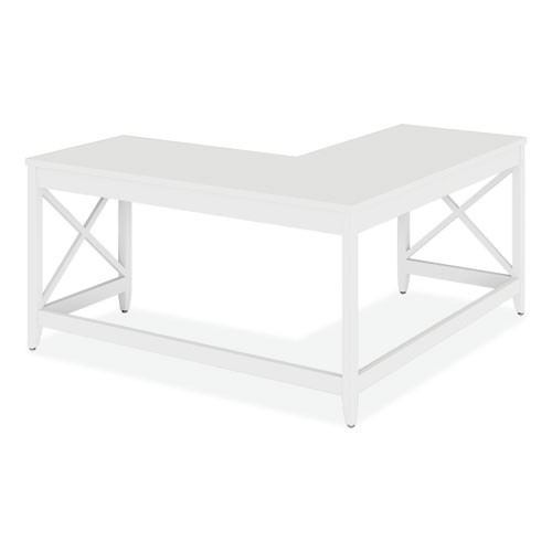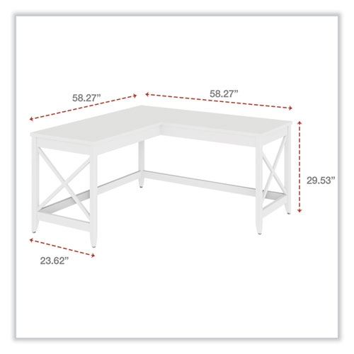 Stylish, L-shaped, farmhouse desk with X accents on side panels. The multi-function desk is constructed with a smooth, laminate wood top and white wood legs. The simple design without drawers fits conveniently into a corner to maximize space. Wide tabletop surfaces provide ample space to work and display organizational or decorative items. The open design has a light, airy feel, and coordinates with most décor. Some assembly is required.