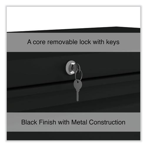 Drawers with side-to-side hang rails to accommodate letter/legal hanging files. Full drawer extension on steel ball bearing telescoping slide suspension helps drawers glide with ease. Stylish, full-width radius edge recessed pulls help to quickly open and close drawers. Anti-tipping interlock system allows only one drawer to open at a time. Single key core removable lock with two keys. Four adjustable leveling glides. Durable powder coated finish helps prevent scratches.