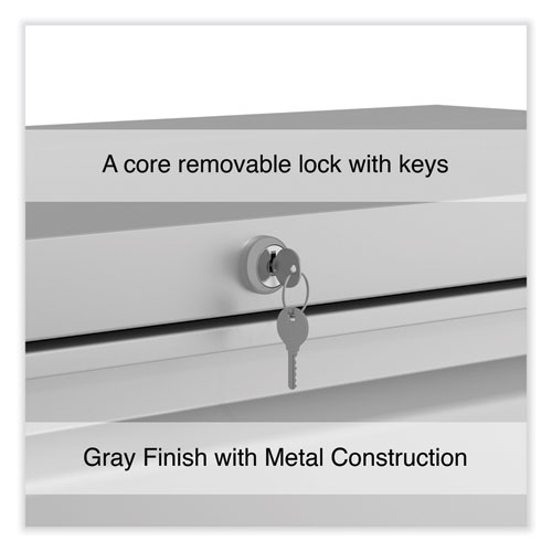Drawers with side-to-side hang rails to accommodate letter/legal hanging files. Full drawer extension on steel ball bearing telescoping slide suspension helps drawers glide with ease. Stylish, full-width radius edge recessed pulls help to quickly open and close drawers. Anti-tipping interlock system allows only one drawer to open at a time. Single key core removable lock with two keys. Four adjustable leveling glides. Durable powder coated finish helps prevent scratches.