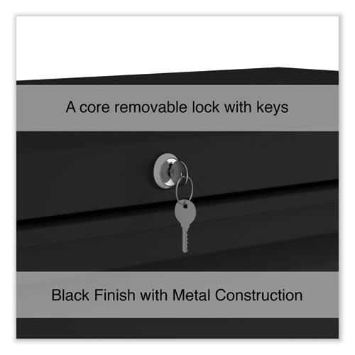 Drawers with side-to-side hang rails to accommodate letter/legal hanging files. Full drawer extension on steel ball bearing telescoping slide suspension helps drawers glide with ease. Stylish, full-width radius edge recessed pulls help to quickly open and close drawers. Anti-tipping interlock system allows only one drawer to open at a time. Single key core removable lock with two keys. Four adjustable leveling glides. Durable powder coated finish helps prevent scratches.