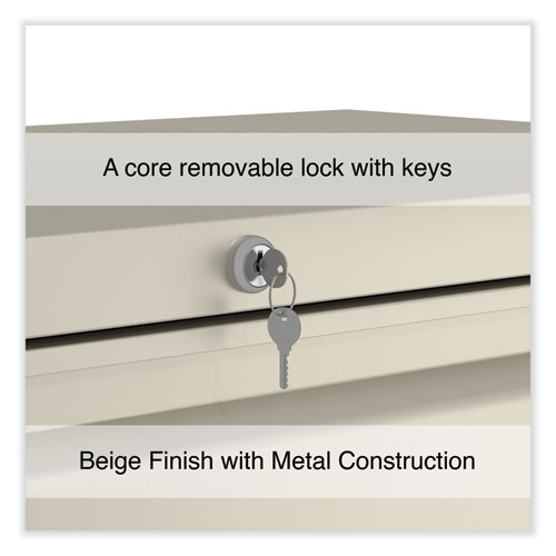 Drawers with side-to-side hang rails to accommodate letter/legal hanging files. Full drawer extension on steel ball bearing telescoping slide suspension helps drawers glide with ease. Stylish, full-width radius edge recessed pulls help to quickly open and close drawers. Anti-tipping interlock system allows only one drawer to open at a time. Single key core removable lock with two keys. Four adjustable leveling glides. Durable powder coated finish helps prevent scratches.